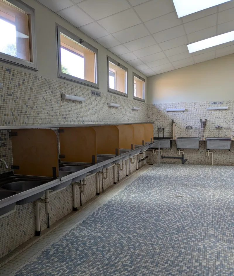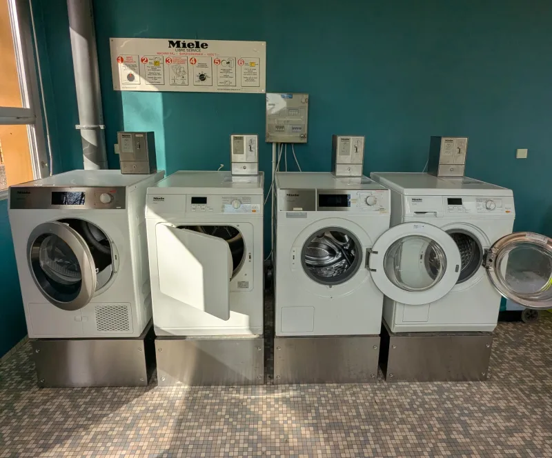 - Un espace laverie avec machines à laver et sèche-linge, et des bacs pour le lavage manuel